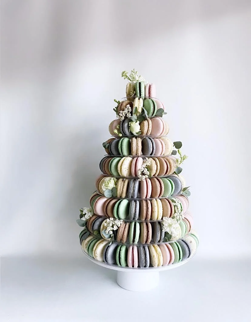 It is stunning and simple, with the macarons being showcased. Add some delicate floral elements for an extra pop!